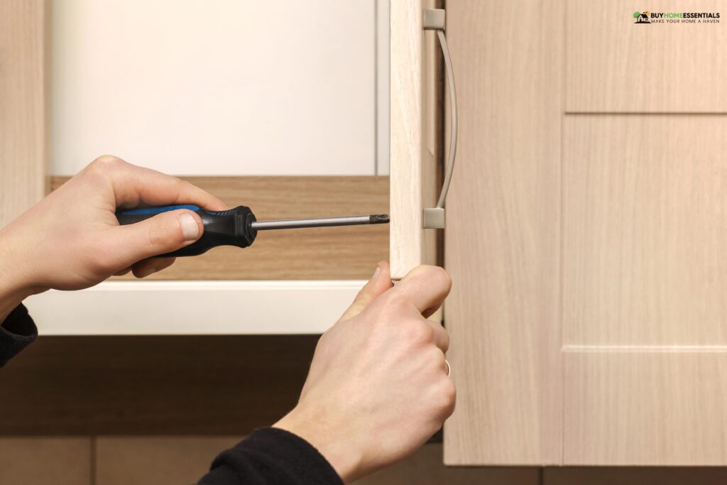 Once the doors and fronts are in place, attach the cabinet hardware knobs, handles, and hinges. If necessary, double-check alignment and functionality.